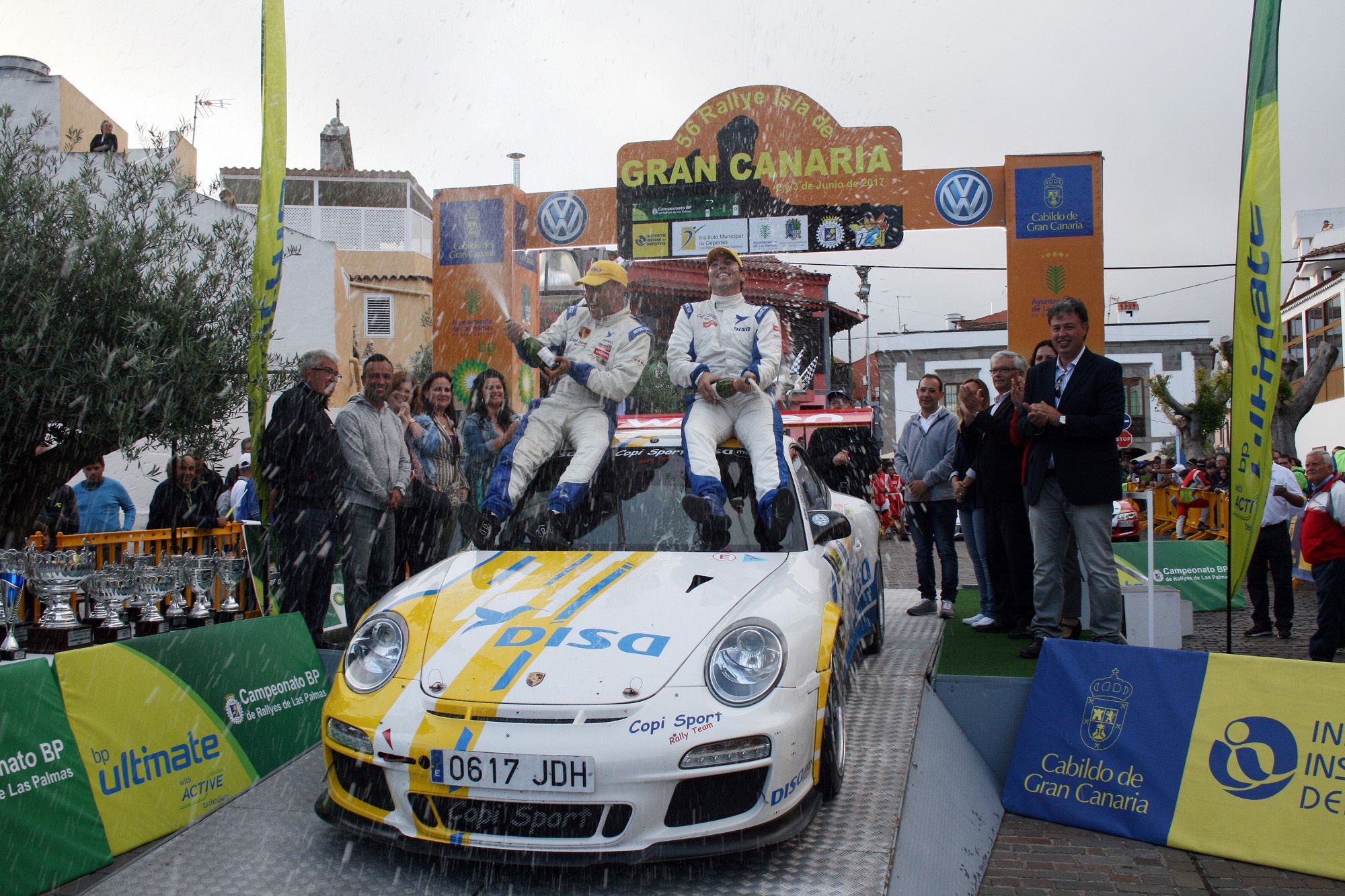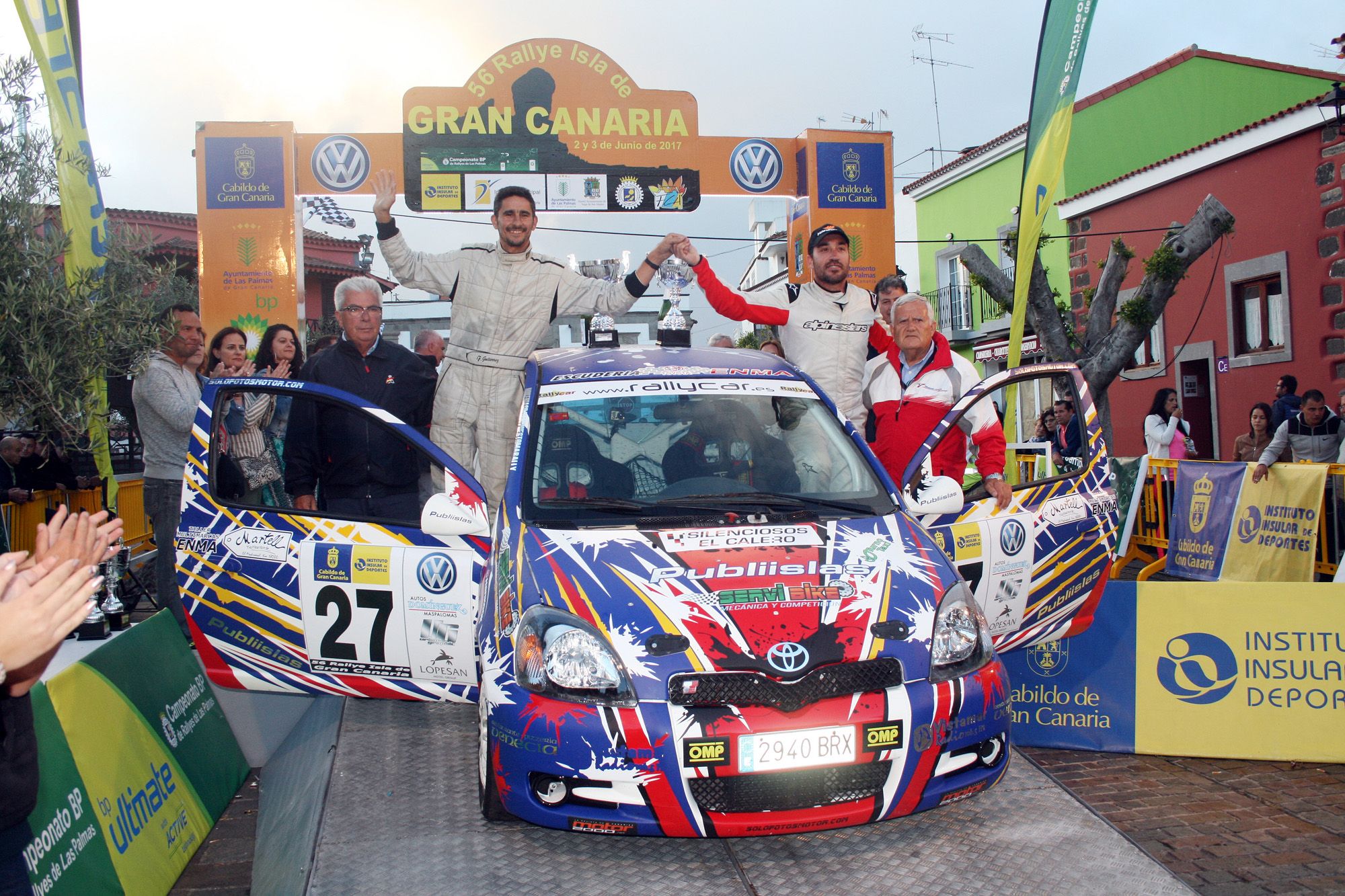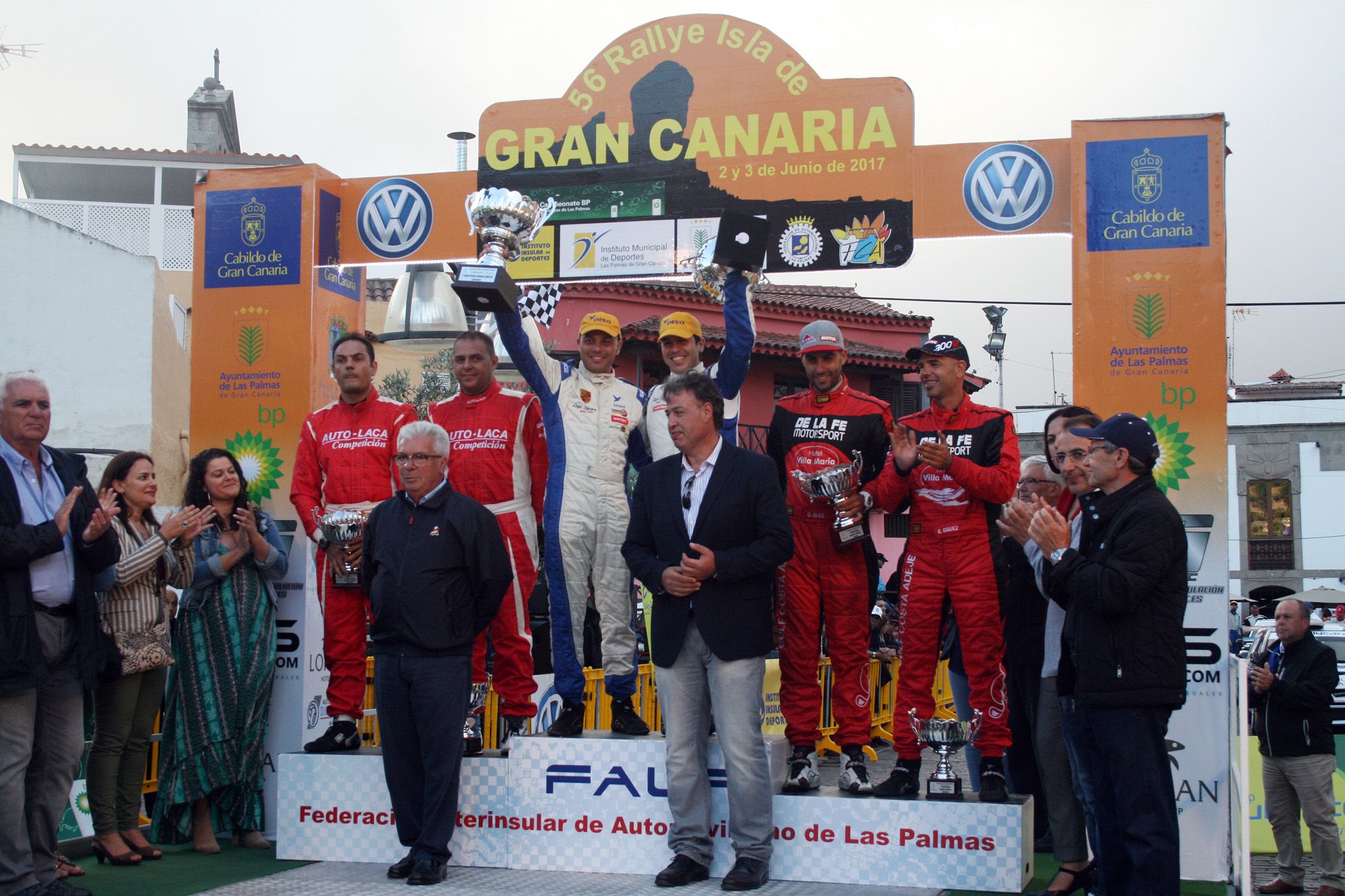 La Vega de San Mateo tenía el honor de acoger la ceremonia de llegada y la entrega de premios final y hasta allí llegaron Enrique Cruz-Yeray Mujica como merecidos vencedores de la 56ª edición del Rallye Isla de Gran Canaria, Trofeo “Naviera Armas” (fotografía inferior).