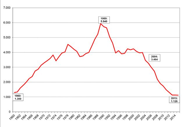 La cifra de fallecidos representa el mínimo histórico desde 1960, primer año en el que se tienen estadísticas, cuando hubo 1.300 muertos, con un escenario de movilidad absolutamente distinto (en 1960 había un millón de vehículos y en 2015 el parque automovilístico sobrepasa los 31 millones).