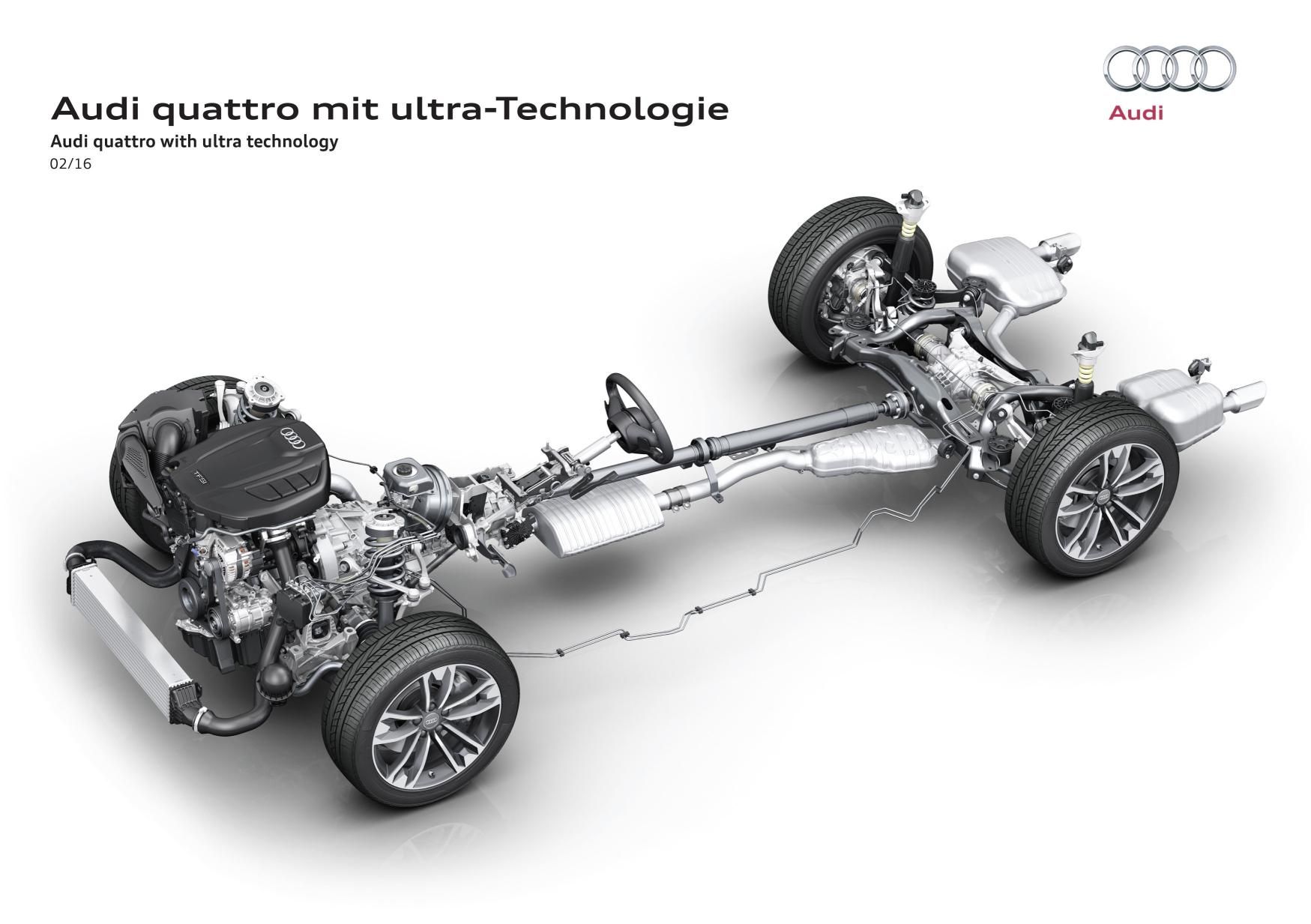 19 de febrero de 2016.- Audi abre un nuevo capítulo en la historia de quattro: el nuevo sistema quattro con tecnología ultra combina dinámica de conducción y seguridad con alta eficiencia, configurando así el sistema de transmisión integral adaptado al futuro. Este sistema ha sido desarrollado para numerosos modelos Audi con motor delantero montado longitudinalmente. Una variante inicial debutará en el nuevo Audi A4 allroad quattro a mediados de 2016.