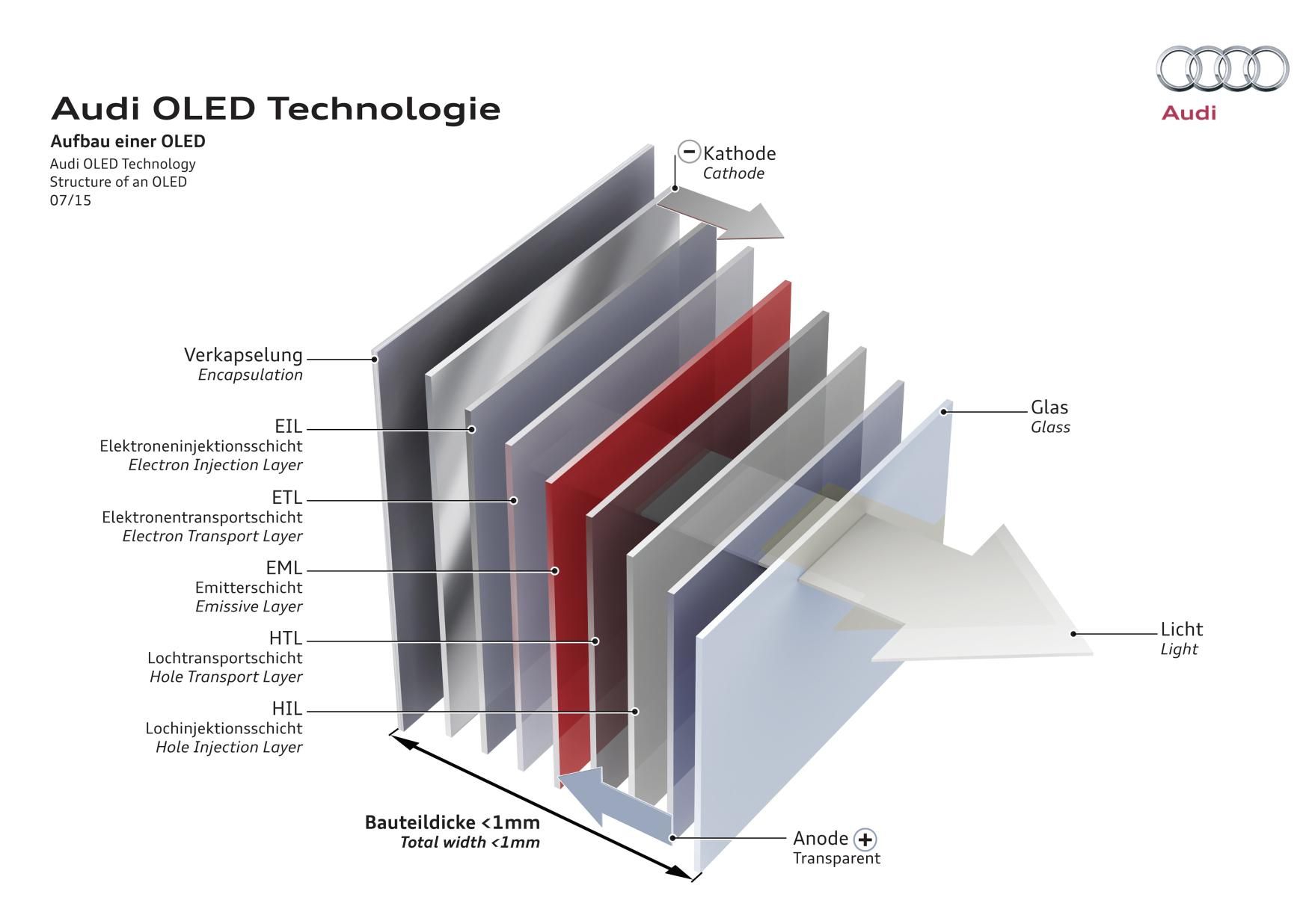 Los avances en la tecnología de iluminación OLED son muy rápidos, en parte debido al impulso proporcionado por Audi en este campo. En cuanto se consiga una mayor densidad de luz, la tecnología OLED también podrá utilizarse para los intermitentes y las luces de freno. Las delgadas láminas de vidrio que se utilizan actualmente para revestir el material orgánico serán reemplazadas por películas de plástico, y la flexibilidad de estos materiales permitirá crear formas en tres dimensiones, abriendo así nuevas campos creativos para los diseñadores.