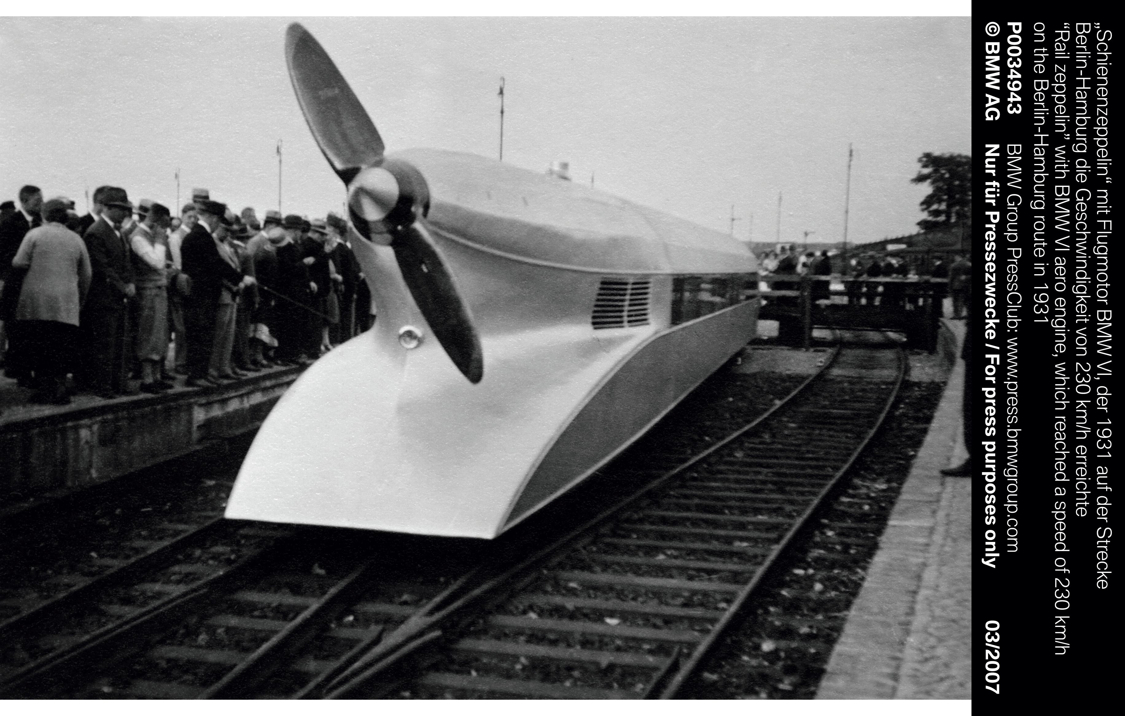El “Rail Zeppelin” con motor BMW VI de doce cilindros construido por el diseñador de trenes Franz Kruckenberg alcanza una velocidad de 230 km/h y marca por tanto un nuevo record mundial de velocidad para vehículos sobre vía (fotografía superior).