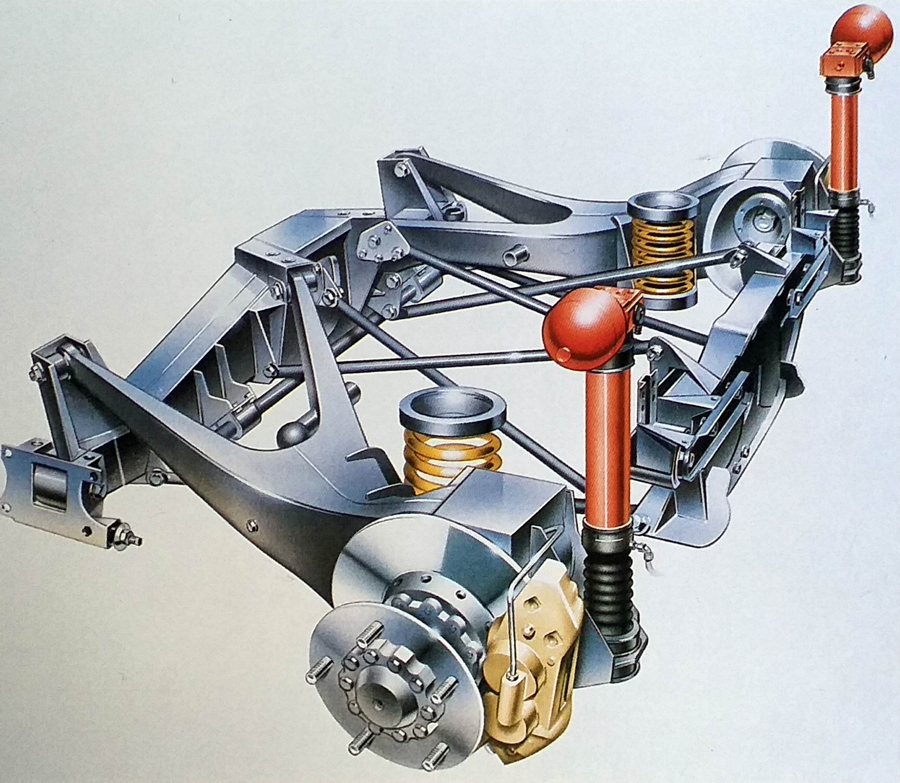 - Delantera: independiente, formada por un conjunto formado por un muelle helicoidal con brazo oscilante transversal inferior, palancas superiores elásticas, amortiguadores telescópicos con control de suspensión variable automática y barra antivuelco.