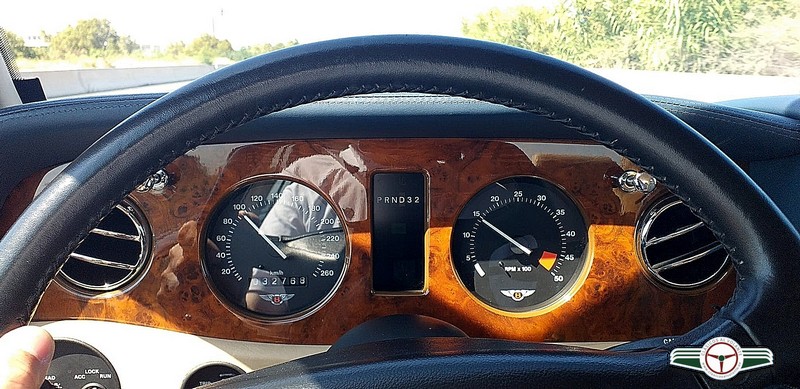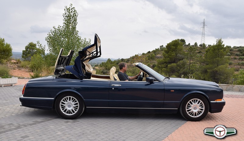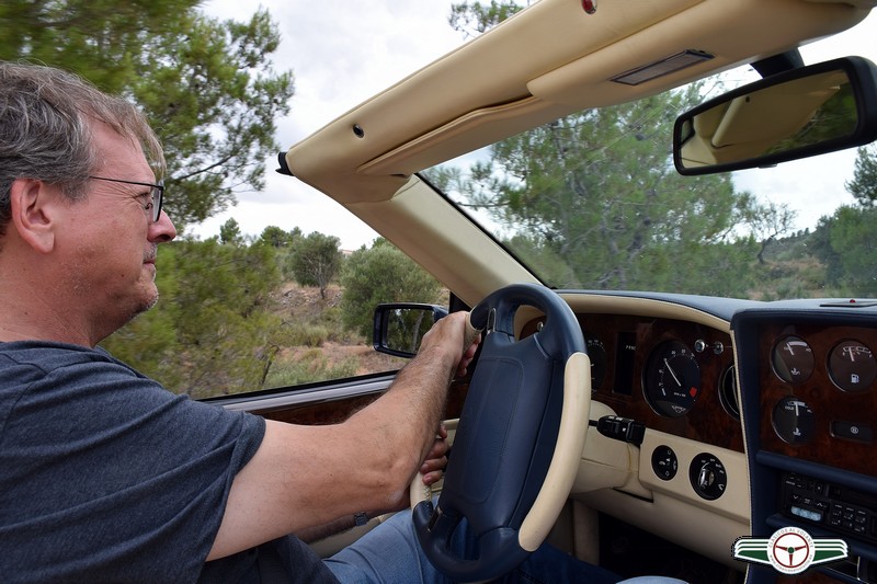 La jornada empezó visitando con nuestro amigo Luis, experto en estos vehículos, la colección de vehículos clásicos que atesora el orgulloso propietario del Azure. Tras admirar algunas de sus joyas, tocó el momento de dirigirnos a la nave garaje donde guardaba el Bentley. El mismo, ubicado a las afueras de un pequeño pueblo, ofrece la tranquilidad e intimidad deseadas, pero también pone a prueba todos los sentidos del conductor dado lo complicado del acceso al mismo. Tras retirar la funda que lo protegía del polvo y realizar una ligera limpieza, nos pusimos al volante. Bentley en estos años ya ofrecía un sistema eléctrico de ajuste del volante, aparte de los asientos, que permite que este se desplace parcialmente hacia arriba para facilitar el acceso al puesto de conducción. Los asientos delanteros tienen una forma específica que no se vio en otros modelos Bentley, y derivan de los usados por los BMW de la serie 8, marca que suministró durante aquellos años determinados equipos mecánicos y de equipamiento a Rolls-Royce y Bentley. Mientras dejo que el motor coja temperatura me recreo en la riqueza del habitáculo, donde destaca el habitual perfume de la piel que tapiza todos los rincones del interior y la belleza de las planchas de raíz de nogal que decoran salpicadero y puertas. Ya con el motor caliente, sacamos el Bentley de la nave marcha atrás accediendo a un encosterado callejón, donde tendremos que dar la vuelta para acceder a la calle. En situaciones como estas me percato realmente del inmenso tamaño del Azure, que sobrepasa los cinco metros de longitud. Al estar puesta la capota la visión trasera se ve limitada, porque la ventanilla de la capota no es muy grande y porque el plástico de la misma con los años ha amarilleado y perdido transparencia. Así que debo confiarme a los espejos retrovisores, por fin colocados en una posición racional y de un generoso tamaño, y tener mucho cuidado. En este momento echo de menos las cámaras de marcha atrás que ya encontramos en cualquier utilitario. Poco a poco saco el gran coche sin problemas y hago las maniobras para poder acceder a la vía pública. El cambio automático y la suave dirección asistida permiten que este tipo de maniobras se realicen sin esfuerzo, empleando sólo el pie derecho y las manos. Instantes después accedemos a la calle principal del pueblo. La prueba del Azure ha empezado.