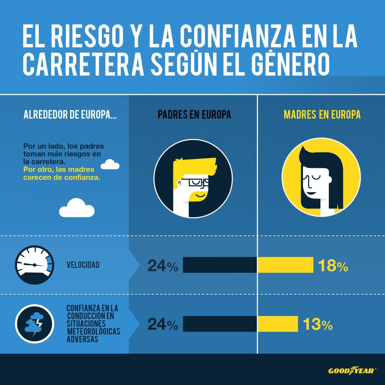 De acuerdo con la investigación previa que Goodyear realizó entre conductores noveles y profesores de autoescuela, los hombres jóvenes también son más propensos a correr que las mujeres jóvenes (70% frente al 62%). Al parecer, los profesores de autoescuela son conscientes de este hecho y la mayoría de los profesores de autoescuela de la UE está de acuerdo en que en la cultura occidental, la velocidad en la carretera está mitificada como un símbolo de masculinidad (52%).