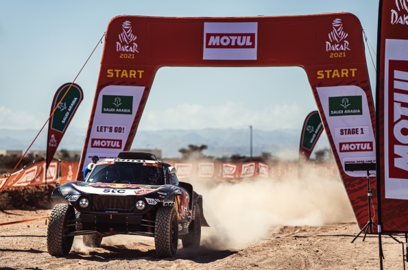 4.1.2021.- Carlos Sainz y Lucas Cruz han conseguido la victoria en la primera etapa del Dakar 2021, al volante del MINI JCW Buggy con dorsal 300. A pesar de salir en la vigesimoctava posición, tener que adelantar a vehiculos más lentos y de sufrir un pinchazo, el dúo español ha realizado una actuación memorable. Gracias a este triunfo, Sainz y Cruz se colocan en la primera posición de la clasificación general. Es la 37ª victoria de etapa del piloto español en el Dakar.
