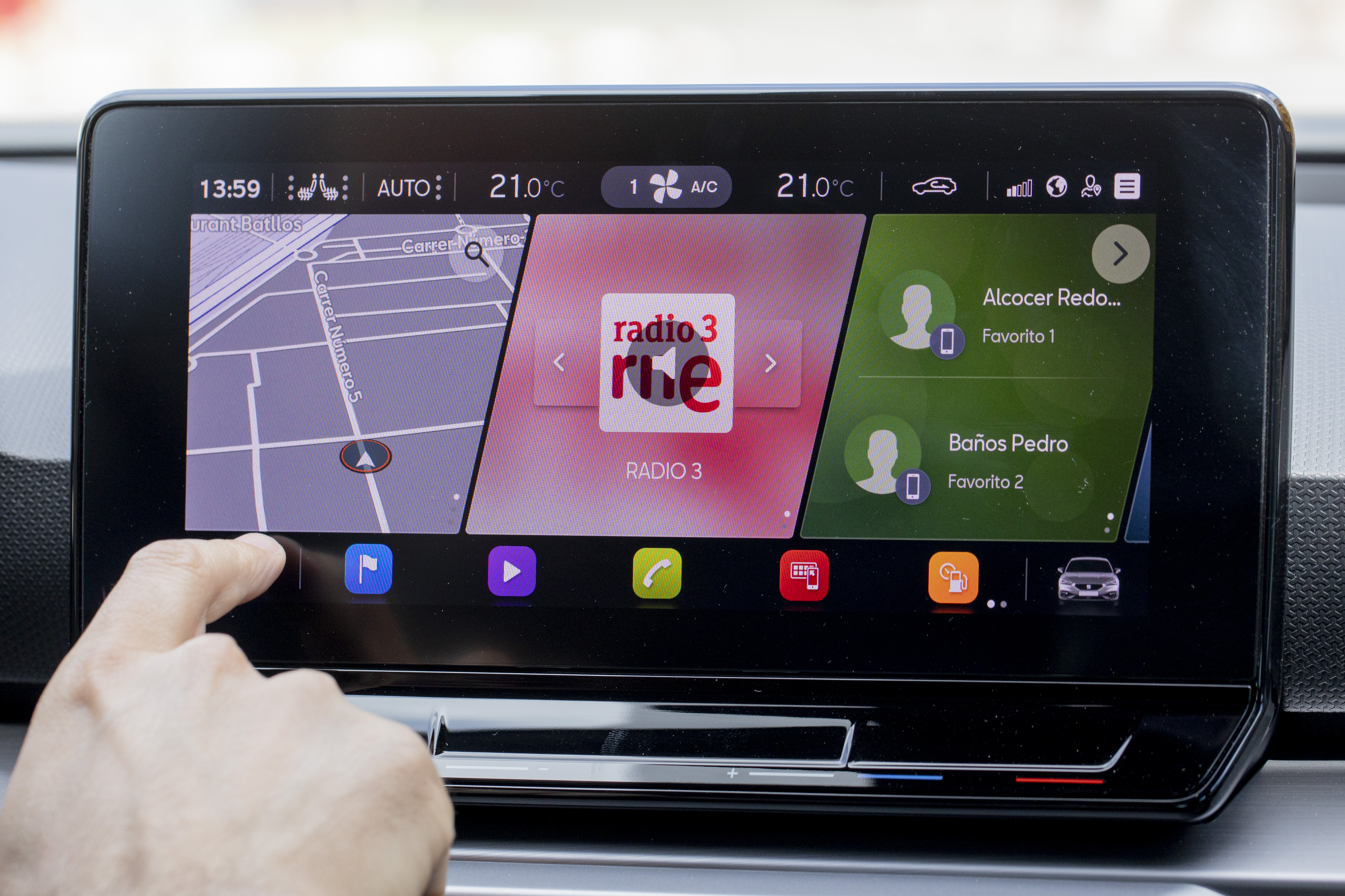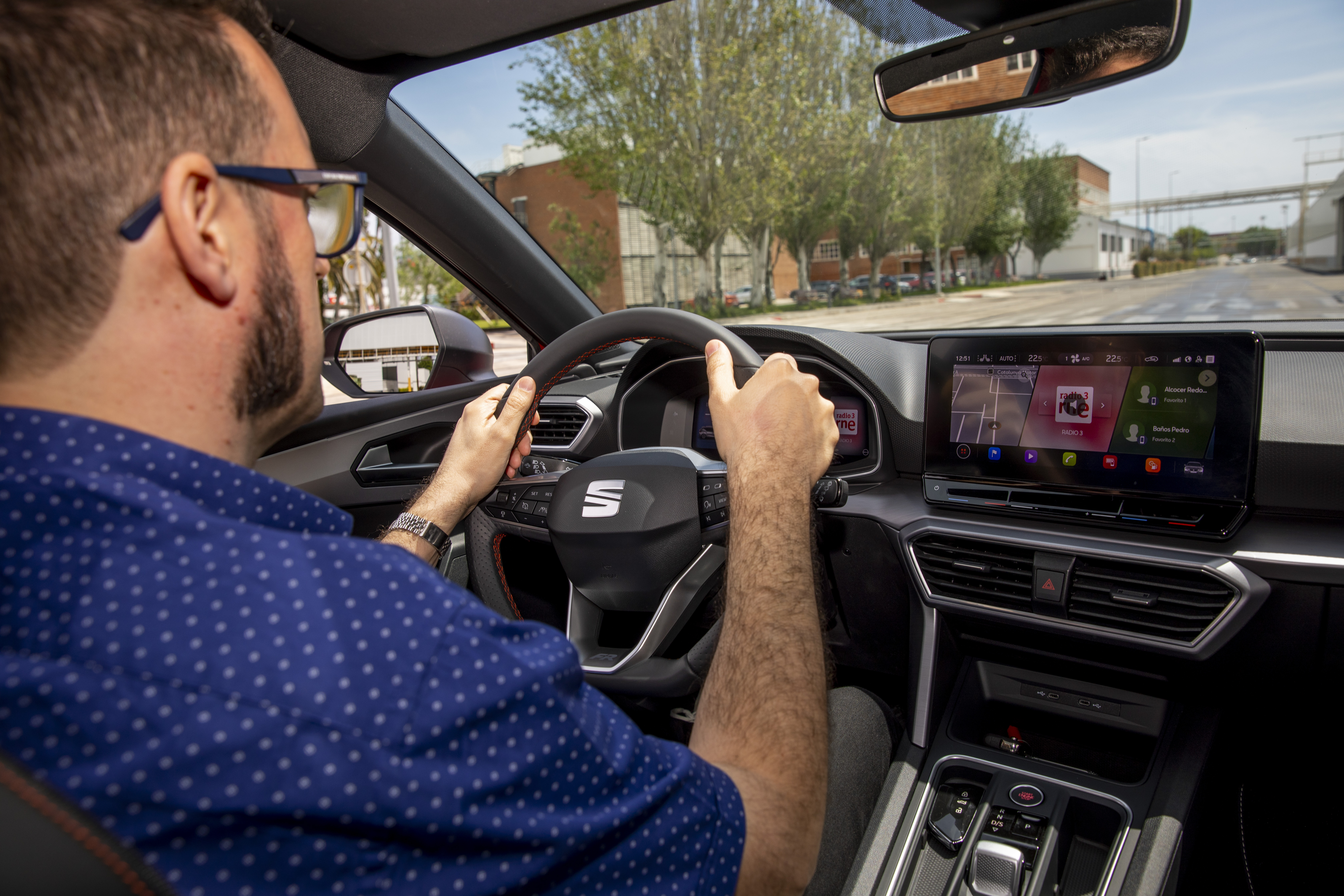 La pantalla del nuevo León, de 10 pulgadas, incluye hasta 2.000 iconos específicamente diseñados para cada función con una identidad propia y estética SEAT. En el display de inicio aparecen tres widgets principales completamente personalizables, una barra de aplicaciones y acceso directo a la climatización, integrada, así como a otras 12 funcionalidades, entre las cuales destacan los servicios multimedia, navegación y la conexión con el móvil. Según Dani Molina, este sistema digital es clave para la relación del usuario con el coche: “dependiendo de las necesidades del usuario, uno podrá decidir si quiere tener navegación y teléfono en su pantalla principal, porque es lo que más usa, y otro que no necesite navegación quizás preferirá ver en primer lugar el configurador de modos de conducción y la radio”.