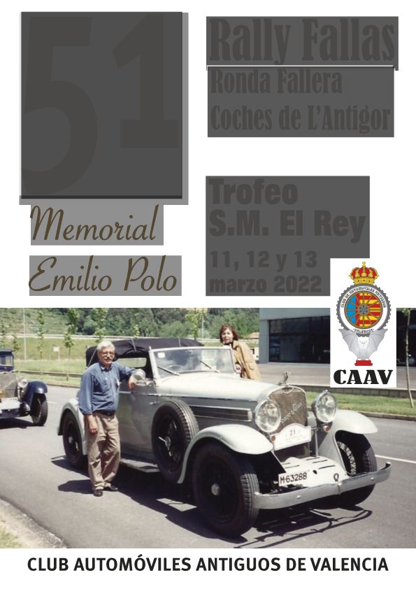 El club valenciano organiza para los días 11, 12 y 13 de marzo de marzo su edición 51 de la Ronda Fallera de Coches de l´Antigor – Trofeo de SM El Rey, que rendirá homenaje al historiador del mundo del automóvil, y en particular de la marca Hispano Suiza, Emilio Polo García. Al igual que en la edición anterior del rally el centro neurálgico del mismo será el Hotel Bayren de Gandía.
