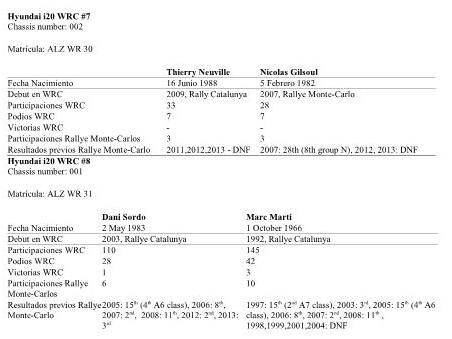 En su séptima participación en el Rallye de MonteCarlo, Sordo (Hyundai i20 WRC número 8) aportará una experiencia y un historial probado para debutar con el equipo: «Marc (Martí, copiloto) y yo estamos encantados de empezar esta temporada con el Shell World Rally Team Hyundai en el debut del equipo en el Rallye MonteCarlo. En esta carrera me siento muy cómodo ya que tengo gran experiencia por estos caminos aunque se trata de un rally impredecible. Cualquier cosa puede suceder en función de las condiciones meteorológicas que te encuentres por el camino. Queremos terminar este rally y darle al equipo la mayor información posible para continuar el trabajo de desarrollo», dijo Sordo. «Hicimos un par de días de pruebas con el Hyundai i20 WRC en diciembre y un día adicional esta semana. La primera impresión es positiva, aunque todos sabemos que aún hay mucho trabajo por hacer. El objetivo de la prueba pre-carrera fue llegar a conocer el coche lo más posible en primera instancia, pero, al mismo tiempo que tuvimos que encontrar la mejor puesta a punto para el rally. A pesar de que nos unimos al equipo oficialmente hace tan sólo un mes, ya tenemos una buena sensación sobre la escudería, todo el mundo está motivado y dispuesto a hacer el mejor trabajo posible», concluyó el español. (Foto: Marc Martí y Dani Sordo)