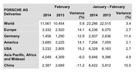 Stuttgart, 12.03.2014.- In February 2014, Porsche AG again increased deliveries to customers. With 11,061 cars sold worldwide, the sports car manufacturer had an increase of just fewer than six per cent compared to the same month last year. In the first two months of 2014, Porsche sold its customers a total of 23,286 new cars.