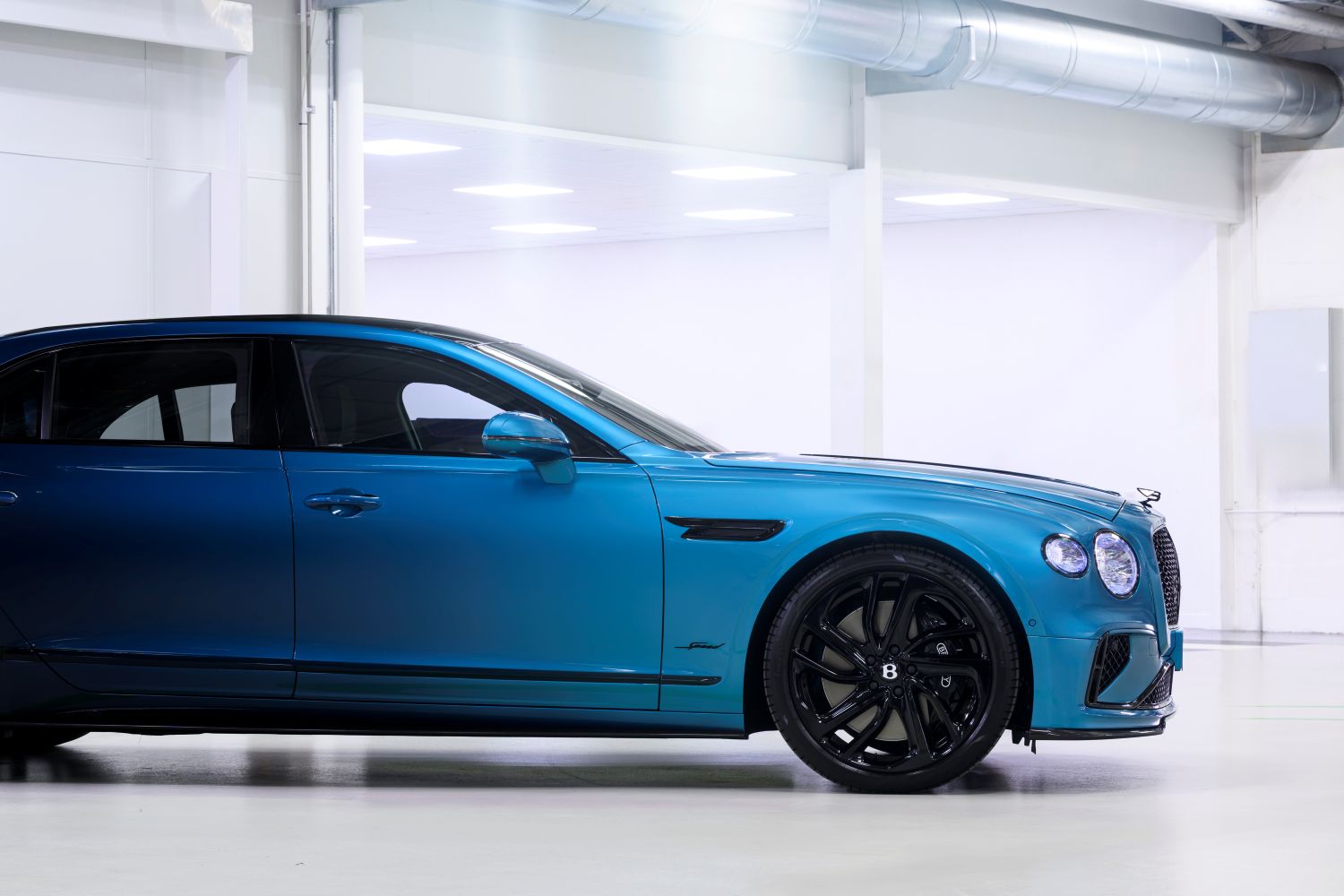 The new Flying Spur’s paint transitions from vibrant Topaz Blue at the front, to the darker Windsor Blue rear, with the fade occurring through the mid-section of the car across the doors, sills and roof. The process takes nearly 60 hours for two highly skilled paint technicians to complete, and starts with the spraying of the individual colours at the front and rear of the body. The transition happens across the centre of the car and is applied in stages, using paint that has been tinted using traditional mixing methods to achieve the Ombré effect – with extreme car taken that the transition is symmetrical across the car.