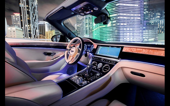 At the heart of both the GT V8 and GT V8 Convertible dashboards are an advanced, fully digital, driver-focussed instrument panel and the optional Bentley Rotating Display. The latter features a 12.3-inch touchscreen housed in a three-sided unit, which revolves the veneer to reveal the touchscreen, as well as three elegant analogue dials.