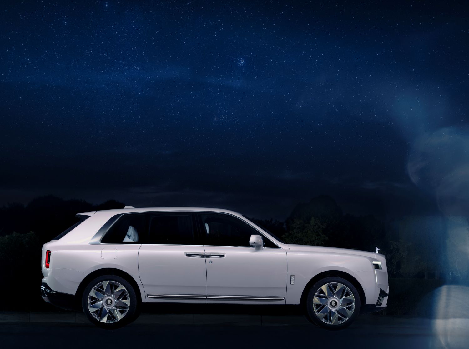 Cullinan Cosmos is finished in shimmering Arabescato Pearl, recalling the soft lustre of moonlight across a midnight sky. The exterior is completed with a hand-painted twin coachline in Charles Blue and an Illuminated Spirit of Ecstasy that glows like a distant star by night.