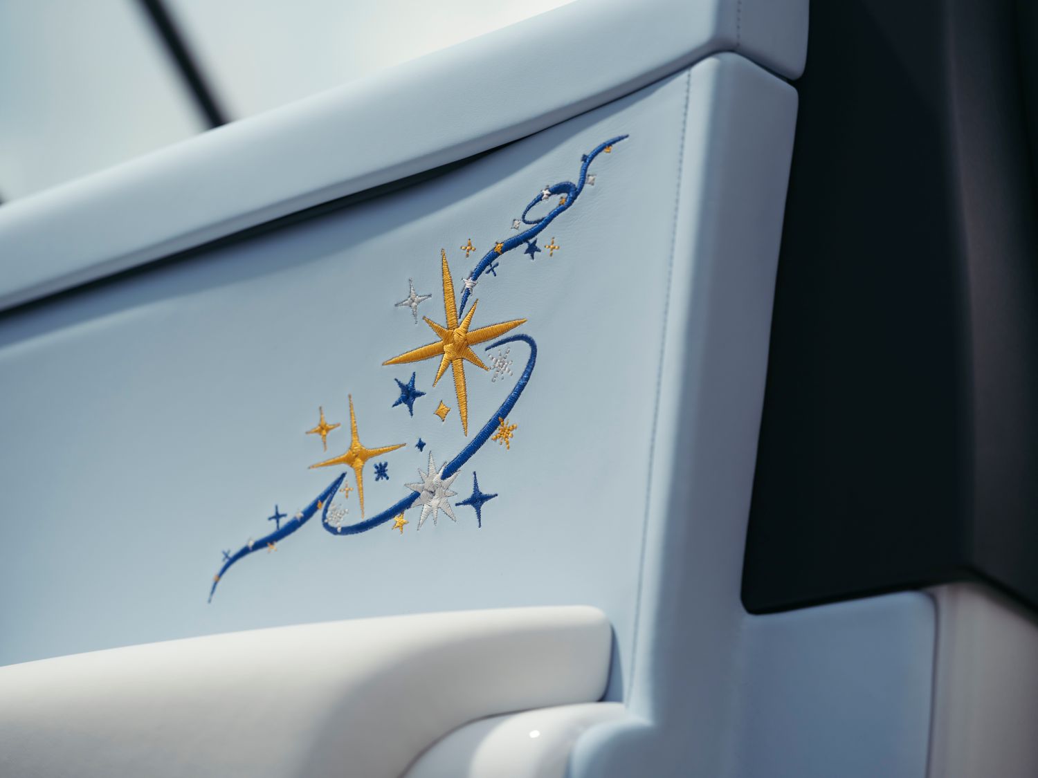 The commissioning clients worked with Rolls-Royce designers to create a unique Star Cluster motif, which appears as Bespoke embroidery on the door panels and headrests, and as a hand-painted artwork on the front passenger fascia.