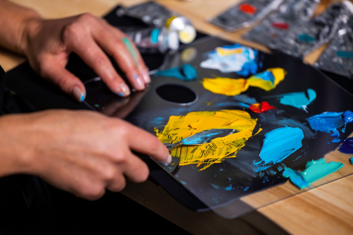 To create the luminous cloud formations, the artist used more than 20 successive applications of acrylic paint, building depth and dimension with a variety of brushes. To achieve the mist effect, the artist turned to an unexpected tool – a makeup brush – to allow the lightest layer of pigments to dry delicately on contact.