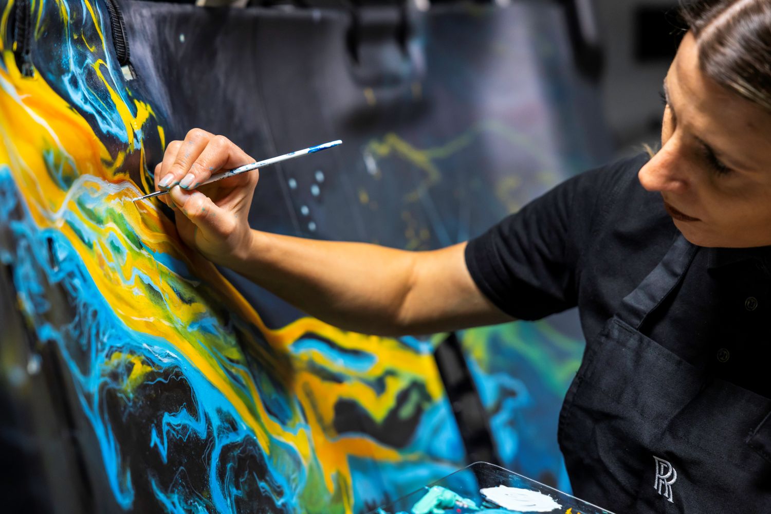 The shimmering field of painted ‘stars’ was formed using a combination of fine, pointed brushes and a speckling technique, giving the final composition an organic, celestial quality. Only once the painting on the Starlight Headliner was completed and sealed were the fibre-optic perforations individually punched and positioned by hand to complement the contours of the artwork.