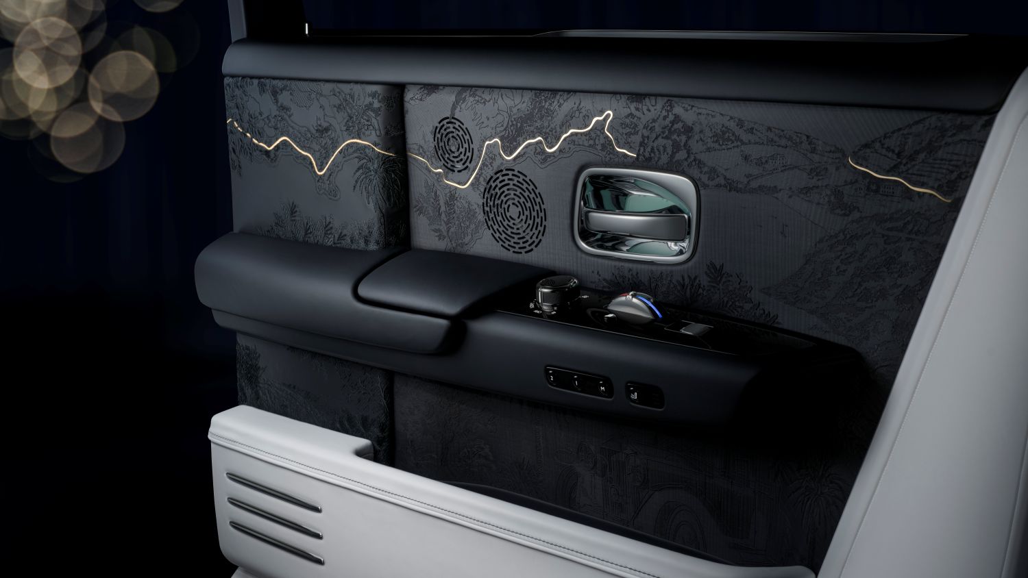 The rear seats of Phantom Centenary are inspired by the famed 1926 ‘Phantom of Love’, commissioned with handwoven Aubusson tapestries. The artwork on the seats unfolds across three distinct layers of storytelling. The first is the background, rendered in high-resolution print, showing places and artefacts from Phantom’s history – from the marque’s original Conduit Street premises in London to Henry Royce’s oil paintings of Southern France. The second layer, also printed in high resolution, portrays great Phantoms of the past in finely drawn detail. The third and uppermost layer is formed of embroideries, abstractly representing seven significant owners from every generation of Phantom.