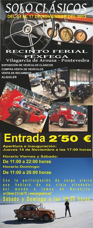 2 de noviembre de 2013.- El recinto ferial Fexfega de Vilagarcía de Arousa (Pontevedra) acogerá del 14 al 17 de noviembre la feria Sólo clásicos. Esta feria está dedicada únicamente al mundo de los clásicos, y en la misma podrá encontrarse: