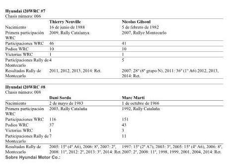 El equipo Hyundai Shell World Rally Team ha inscrito dos Hyundai i20 WRC en el Rally de Montecarlo con los belgas Thierry Neuville / Nicolas Gilsoul (Hyundai i20 WRC #7) y los españoles Dani Sordo / Marc Martí (Hyundai i20 WRC #8), que estarán en los 13 eventos de esta temporada.