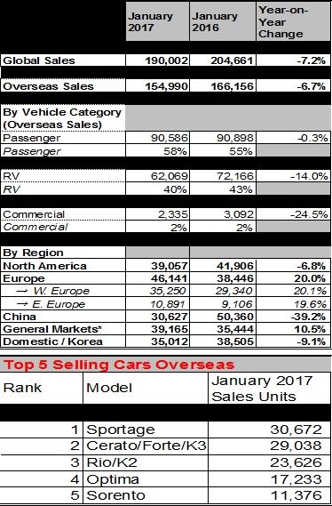El modelo más vendido de Kia en mercados exteriores durante enero de 2017 fue el Sportage, con 30.672 unidades vendidas. El Cerato (del segmento C), también conocido como «Forte» o «K3» en algunos mercados, fue el segundo coche más vendido con 29.038 unidades, seguido del Rio (conocido como «K2» en China), el Optima sedán y el Sorento con 23.626, 17.233 y 11.376 unidades vendidas, respectivamente.