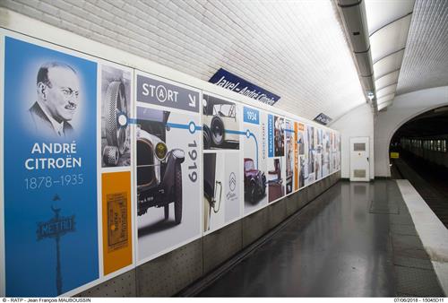 La parisina estación de metro Javel-André Citroën, por la que pasan más de dos millones de viajerxs cada año, sufrió una metamorfosis en junio de 2018 para acoger una escenografía cultural que recoge la historia de Citroën, cuyo centenario se celebra este año.