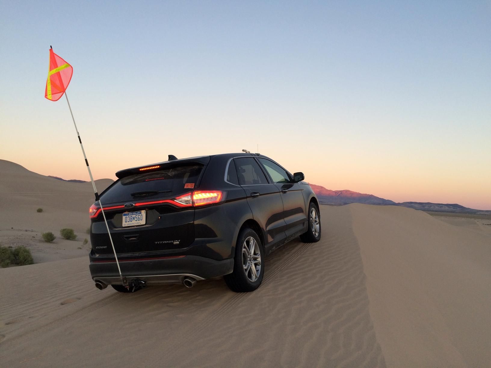“Con el fin de que los entusiastas de los deportes extremos en buggies por las dunas no se lleven una sorpresa demasiado grande al coronar la próxima duna y encontrar un SUV de calle en medio del desierto, hemos sujetado a los mástiles una bandera de 3 metros en modelos como el nuevo Edge para facilitar que pueda verse desde lejos cuando nos metamos en algunos de los terrenos más remotos e implacables de California», cuenta Derek Ward, especialista técnico de Dinámica Avanzada de Vehículos Globales de Ford. “Nuestra tecnología de tracción total inteligente significa que podemos llevar al Edge a través de territorios que muchos clientes se sorprenderían de saber que pueden atacar».
