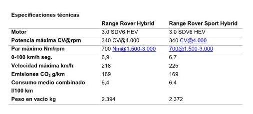 En conjunto, el motor diésel y el motor eléctrico rinden 340 caballos a 4.000 rpm, con un par máximo de 700 Nm entre 1.500 y 3.000 rpm, una cifra líder en su clase y a la altura de lo que ofrece el impresionante SDV8. Range Rover Hybrid y Range Rover Sport Hybrid aceleran de 0 a 100 km/h en menos de siete segundos, ofrecen unas excelentes prestaciones de recuperación y adelantamiento y alcanzan una velocidad máxima de 218 km/h y 225 km/h respectivamente, todo ello combinado con unas emisiones de CO2 de 169 g/km, lo que significa una reducción del 26 % respecto al SDV8 de rendimiento similar y equivale a un consumo de 6,4 l/100 km en ciclo combinado.