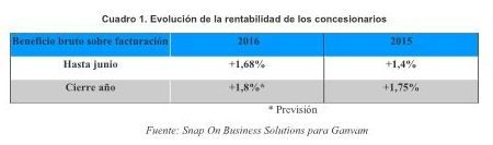 24.11.2016.- La rentabilidad de los concesionarios se sitúo en el 1,7% en el primer semestre, tres décimas más que un año antes (1,4%), según refleja el Informe Rentabilidad de las Redes de Distribución elaborado por Snap On Business Solutions para Ganvam. Las previsiones apuntan a que las redes oficiales cerrarán el ejercicio con una rentabilidad cercana al 2%, frente al 1,75% del año anterior.