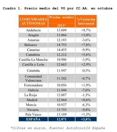 Madrid, 14/11/2013.- Los precios de VO marcan un punto de inflexión al subir un 3,8% después de tres años de caídas ininterrumpidas. El precio medio de los vehículos de ocasión que acceden al mercado a través de la plataforma internacional AutoScout24 marcó en octubre signo positivo por segundo mes consecutivo, con un crecimiento del 3,8%, hasta los 12.871 euros, lo que representa un punto de inflexión después de casi seis años de caídas ininterrumpidas, según recoge su ‘Observatorio europeo de precios’.