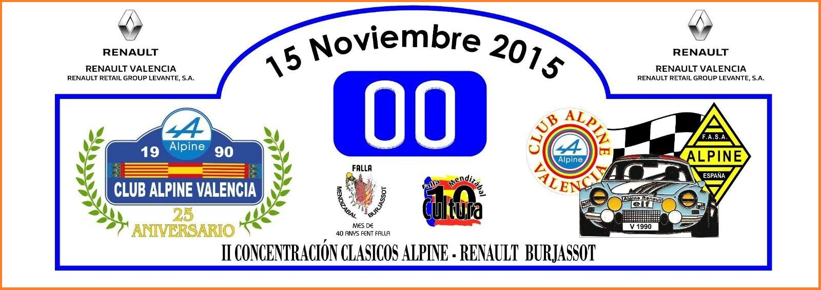 - 09:00h Recepción de vehículos hasta las 10:00 horas, en la Calle Mendizábal número 14, Casal de la Falla Mendizábal de BurjassotP.46100 Valencia. Participarán cualquiera de los modelos de la marca Alpine, y los vehículos de la marca Renault pertenecientes al Club Alpine Valencia.