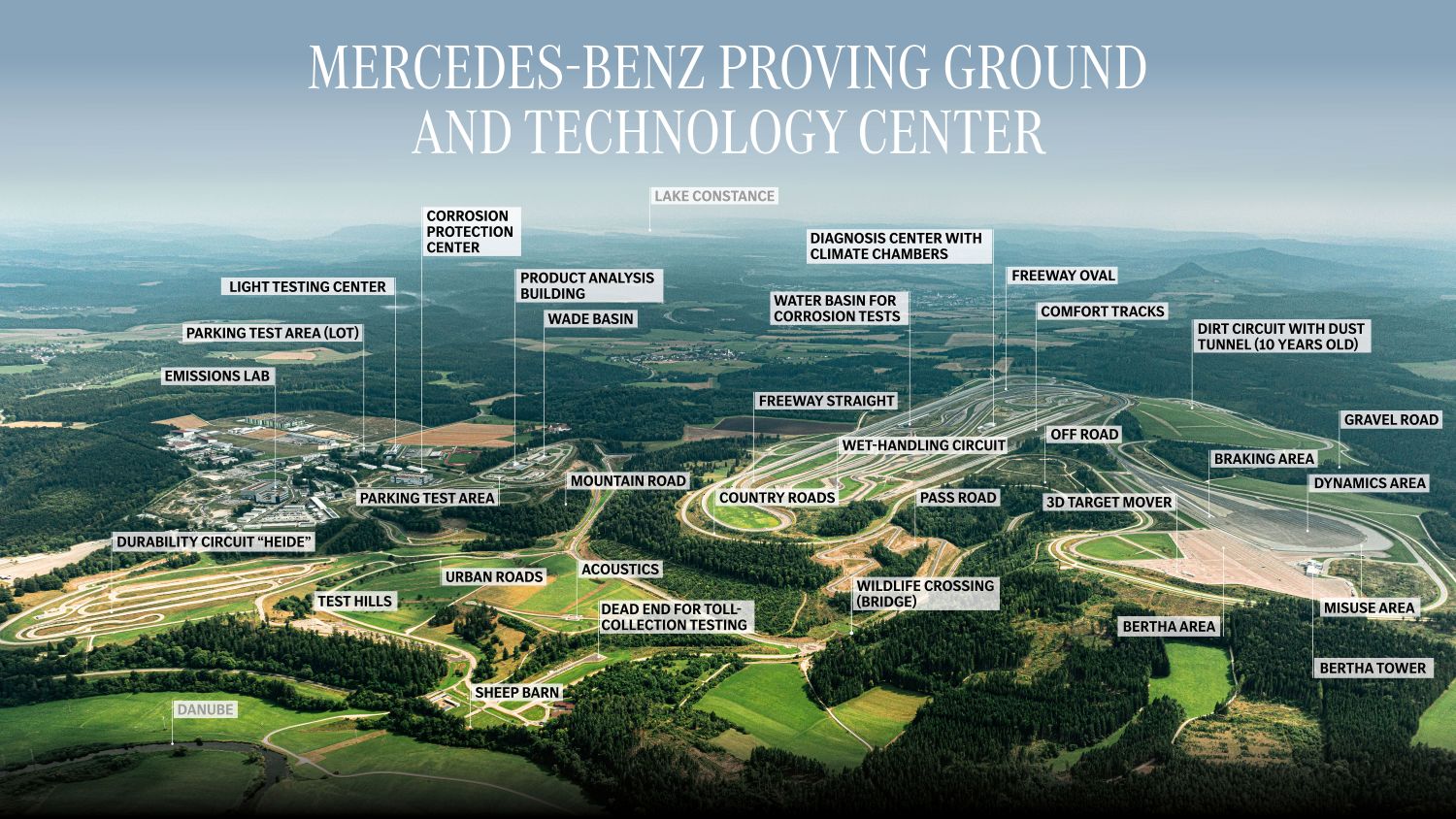 Con una superficie de 520 hectáreas, el campo de pruebas Immendingen combina más de 30 módulos de prueba con un total de 86 kilómetros de pistas de simulación de carreteras y 286 cruces. Los terrenos representan el entorno del tráfico del mundo real de muchas maneras: desde complejas intersecciones urbanas hasta puertos de montaña con casi 180 metros de desnivel, desde carreteras en mal estado y adoquines hasta autopistas y pistas todoterreno. Hay rutas que replican las condiciones de la carretera y las marcas viales de los países europeos, así como copias de carreteras y marcas viales de EE. UU., China o Japón. Un total de hasta 400 vehículos pueden circular por las carreteras al mismo tiempo en los distintos programas de pruebas. También hay pistas especiales con pendientes que van del 30 al 100 por ciento.