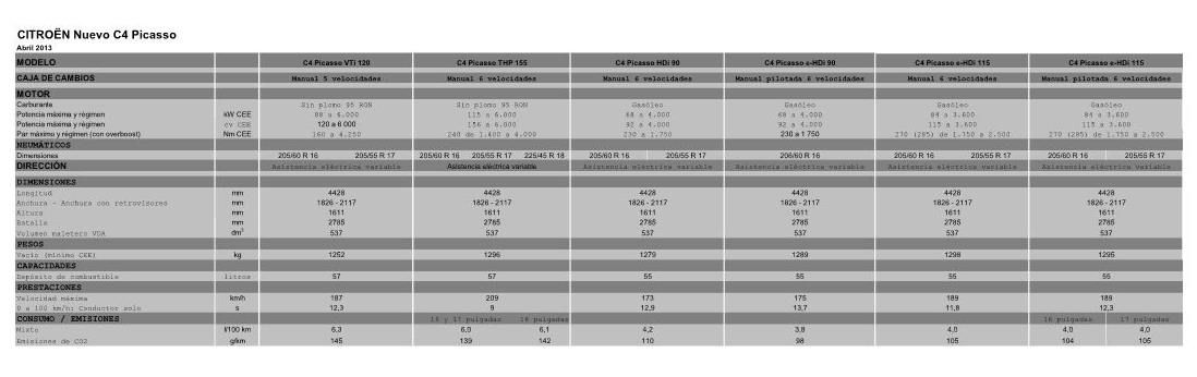 El nuevo Citroën C4 Picasso pesa lo mismo que un C3 Picasso. Este peso reducido, asociado con un tratamiento aerodinámico mejorado (SCx 0,71) y una gama de motores optimizada aportan una disminución importante de las emisiones y del consumo. De media, se han ganado 30 gramos es decir más de 1 litro a los 100 km en relación a la generación precedente.