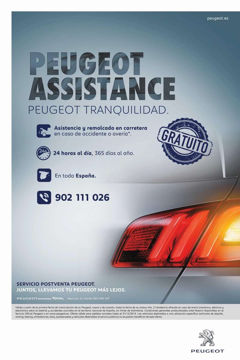 16 de julio de 2014.- Peugeot lanza el nuevo programa Peugeot Assistance Avería y Accidente. Todos los propietarios de un Peugeot de hasta 8 años de antigüedad desde la fecha de la primera matriculación dispondrán de asistencia en caso de avería o accidente, de forma totalmente gratuita y sin necesidad de suscribir ningún contrato ni limitación alguna de kilometraje.