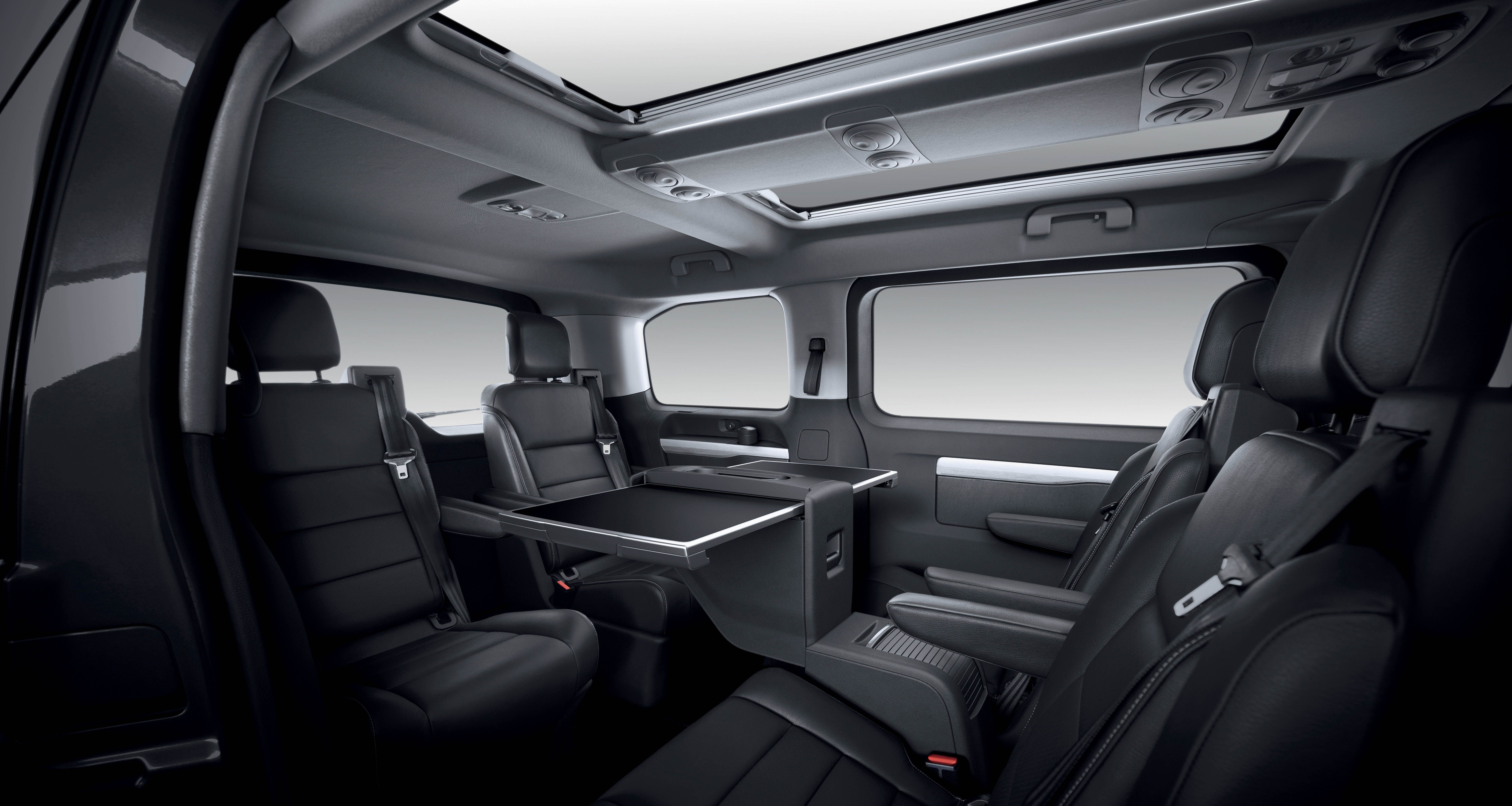 El Peugeot Traveller Business VIP, versión emblemática de la gama, ofrece a los pasajeros traseros la configuración salón de 4 asientos independientes enfrentados o de 5 plazas con la opción de una banqueta de tres plazas en la tercera fila.