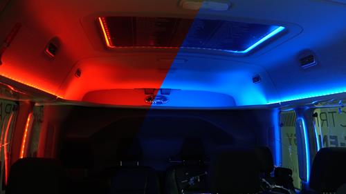 El nuevo minibús eléctrico a batería Transit Smart Energy Concept utiliza luz ambiental para que los pasajeros se sientan más cálidos (con luces rojas) o más frescos (con luces azules). Esto ayuda a aliviar el esfuerzo del sistema de aire acondicionado, de modo que la energía ahorrada puede utilizarse para recorrer más kilómetros.