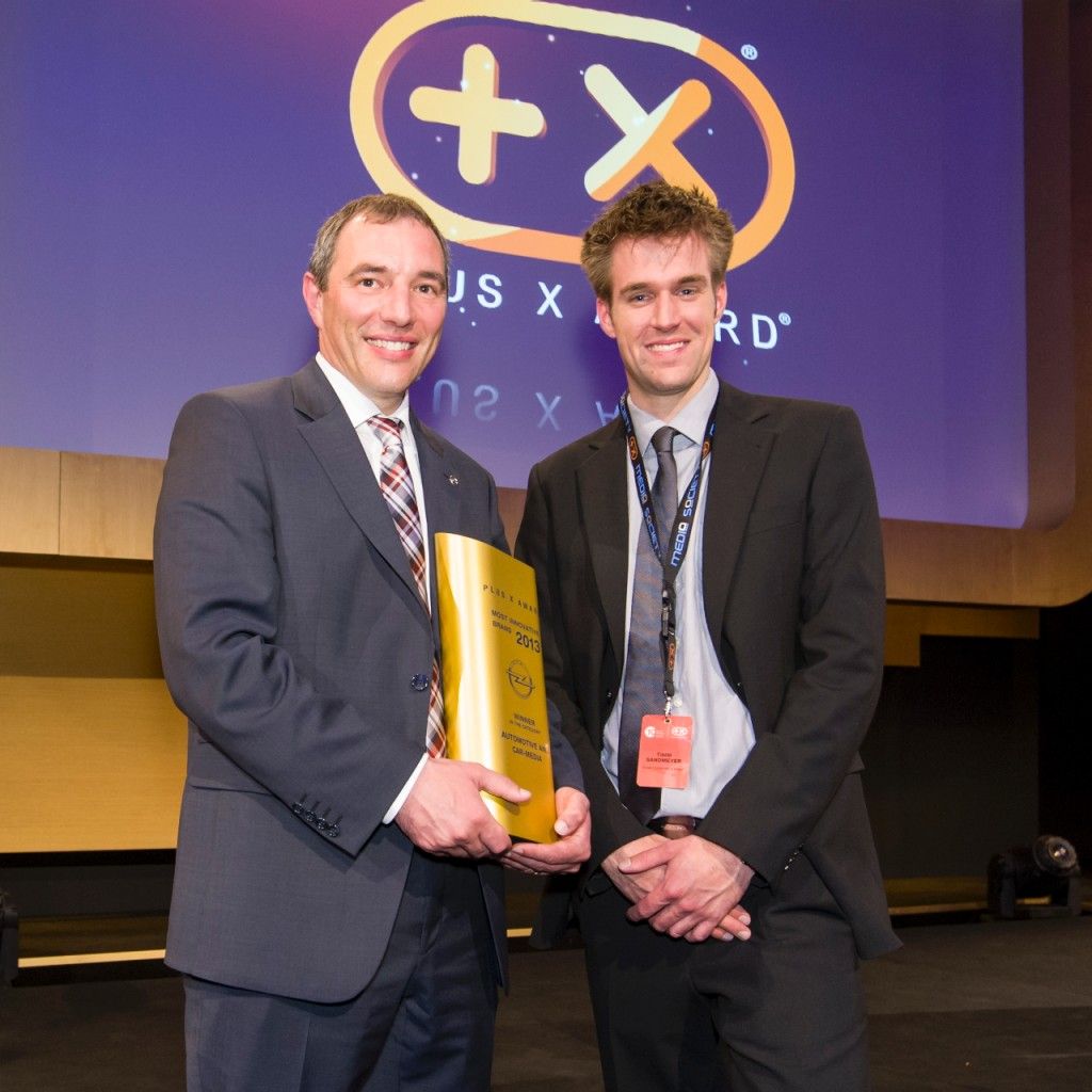 A la derecha, Andreas Marx, Director de Marketing de Opel Alemania recibe el trofeo que acredita a Opel como la “Marca más Innovadora” en el grupo de productos de automoción de manos de Timm Sandmeyer, Director del Jurado de los Premios Plus X Award”
