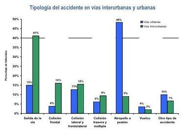 En 2012, la salida de vía (35%) y el atropello al peatón (19%) fueron los accidentes mortales más comunes. Estos porcentajes varían si se disgrega la vía urbana de la interurbana dada la diferente tipología de los accidentes.