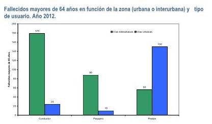 Las personas mayores y en especial los mayores de 74 años han aumentado su tasa de mortalidad por accidente de tráfico en 2012. En concreto, las personas de más de 64 años se vieron implicadas en 8.261 accidentes en los que fallecieron 507 personas de ese grupo de edad (23 más que en 2011), 1.569 resultaron heridas graves y 8.271 leves. Los fallecidos de este grupo de edad suponen el 27% de todas las víctimas mortales.