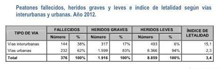 En 2012 fallecieron 376 peatones en accidentes de tráfico (4 menos que en 2011), lo que supone el 20% del total de fallecidos, 1.916 resultaron heridos graves y 8.859 fueron heridos leves.