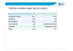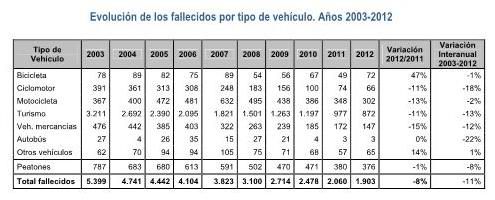En 2012, respecto de 2011, han disminuido las víctimas mortales ocupantes de ciclomotores, motocicletas, turismos y vehículos de mercancías. También se ha constatado un pequeño descenso de los peatones fallecidos por atropello. Los ciclistas fallecidos en 2012 han aumentado respecto del año anterior: 72 fallecidos ciclistas frente a 49 en el año 2011.