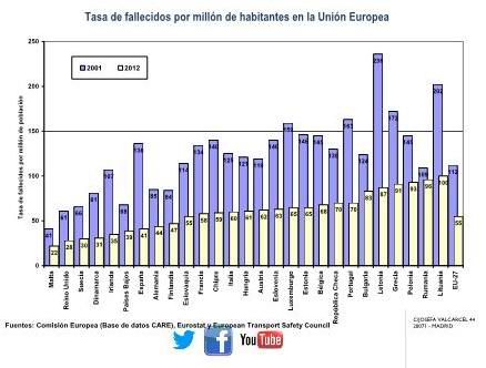 En 2012, en la Unión Europea (27 miembros) se produjeron más de 27.000 fallecidos en accidentes de tráfico, registrándose en España el 7% de ellos.