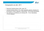 Según fuentes policiales por cada fallecido hubo 5 heridos graves y 55 heridos leves. Por otro lado, la consulta realizada a los sistemas de información sanitaria, que es donde se puede diferenciar y apreciar la diferente complejidad de las lesiones, en 2012 y bajo esa perspectiva hubo 6.044 heridos que sobrevivieron hasta 30 días después del accidente, que fueron ingresados en un hospital y que tienen lesiones especialmente gravosas, (por la duración hospitalaria, dificultad de tratamiento y posibilidad de discapacidad larga) determina que por cada fallecido hubo al menos 12 personas que requirieron ingreso hospitalario y 276 que precisan de asistencia en urgencias o ambulatoria.