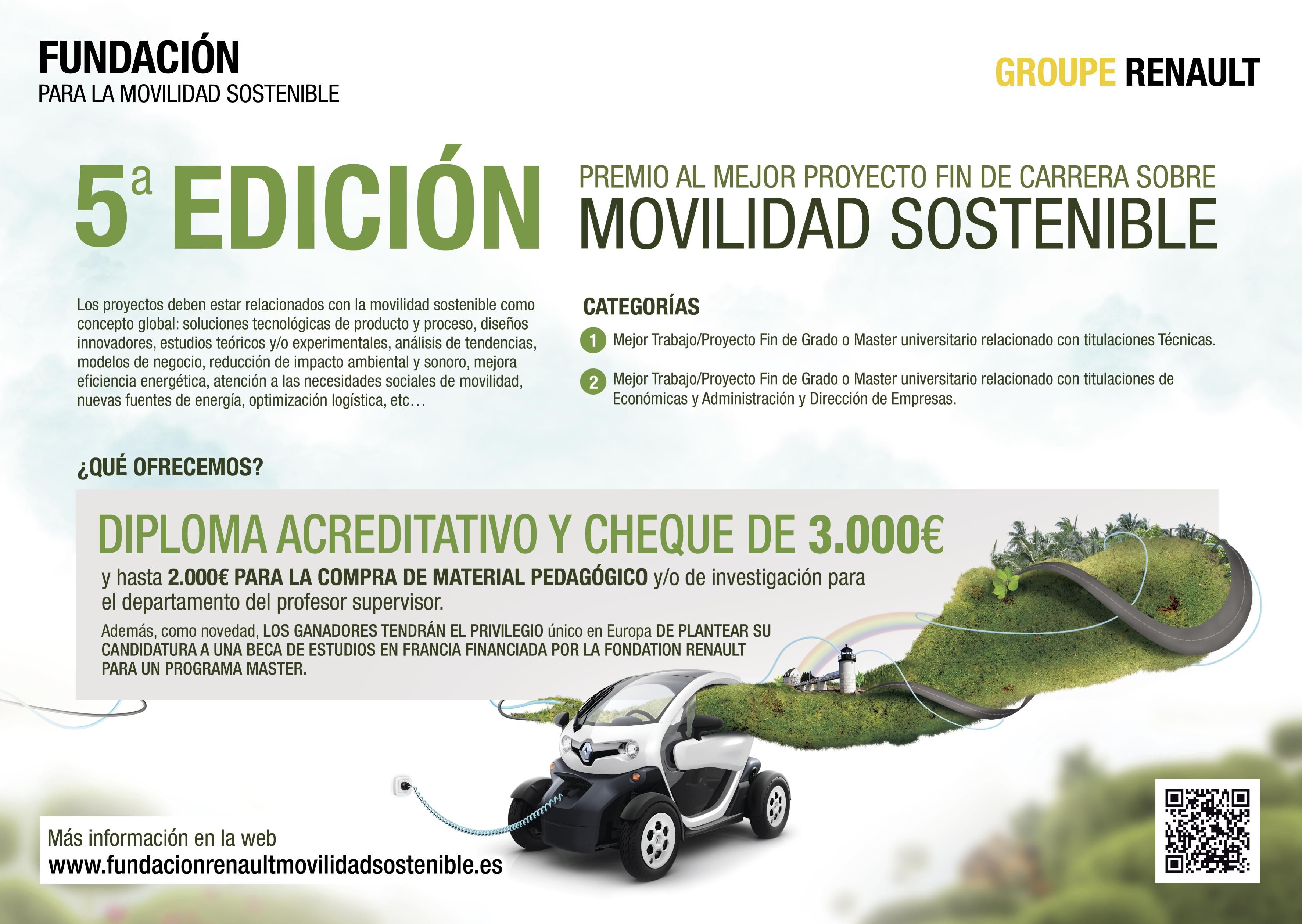 5 de marzo de 2016.- La Fundación RENAULT para la Movilidad Sostenible, de acuerdo a sus fines fundacionales y dentro de sus actividades para el fomento, divulgación e investigación en movilidad sostenible convoca la “5ª Edición del Premio al Mejor Proyecto Fin de Carrera en Movilidad Sostenible”.