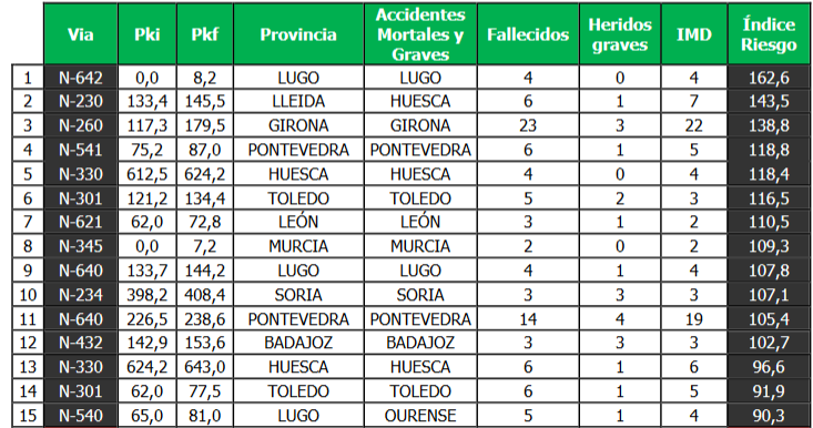 Según el último informe EuroRAP, sólo una de las grandes autovías de España, la N-6, aparece con un tramo de riesgo elevado entre los 50 primeros, y lo hace en el puesto 44. Los 15 peores tramos de riesgo de las carreteras españolas son los siguientes: