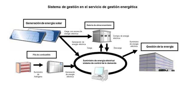 Con este sistema, se proyecta la demanda de energía del servicio de gestión energética, y se consigue un suministro de energía eficiente principalmente a través de las pilas de combustible, de gran eficiencia energética. Éstas se complementan con energía solar, que genera un suministro intercambiable de energía, en combinación con las baterías de almacenamiento. El exceso de energía térmica generada por las pilas de combustible se utiliza posteriormente para el aire acondicionado.