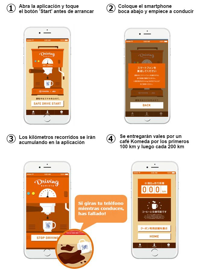 Para ello, se ha desarrollado una aplicación, denominada Driving Barista, que premia a los conductores que no utilicen su smartphone al volante. Así, empleando el sensor de giroscopio para detectar la inclinación del teléfono y el GPS para determinar la distancia recorrida, la aplicación es capaz de saber cuánto tiempo permanece el conductor dejando su smartphone boca abajo. Cuando la distancia acumulada llega a los 100 km, el conductor recibe un vale para canjear en la cadena de cafeterías Komeda.