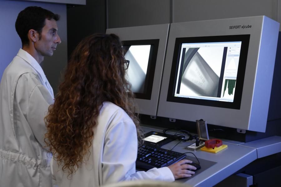 Cada año se realizan un millón de tacs y radiografías. Se trata de alta tecnología que permite “alargar la vida de las piezas y garantizar la calidad de los materiales”, comenta David Patiño, ingeniero de materiales, mientras coge una llanta y la coloca dentro de la cabina.
